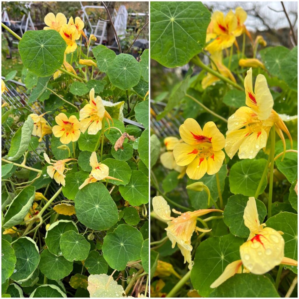Der Wind hat auch hier alles kräftig duschgewirbelt. Ich werde heute noch Laub zusammenkehren, denn da kommt nicht mehr viel runter vom Nussbaum.