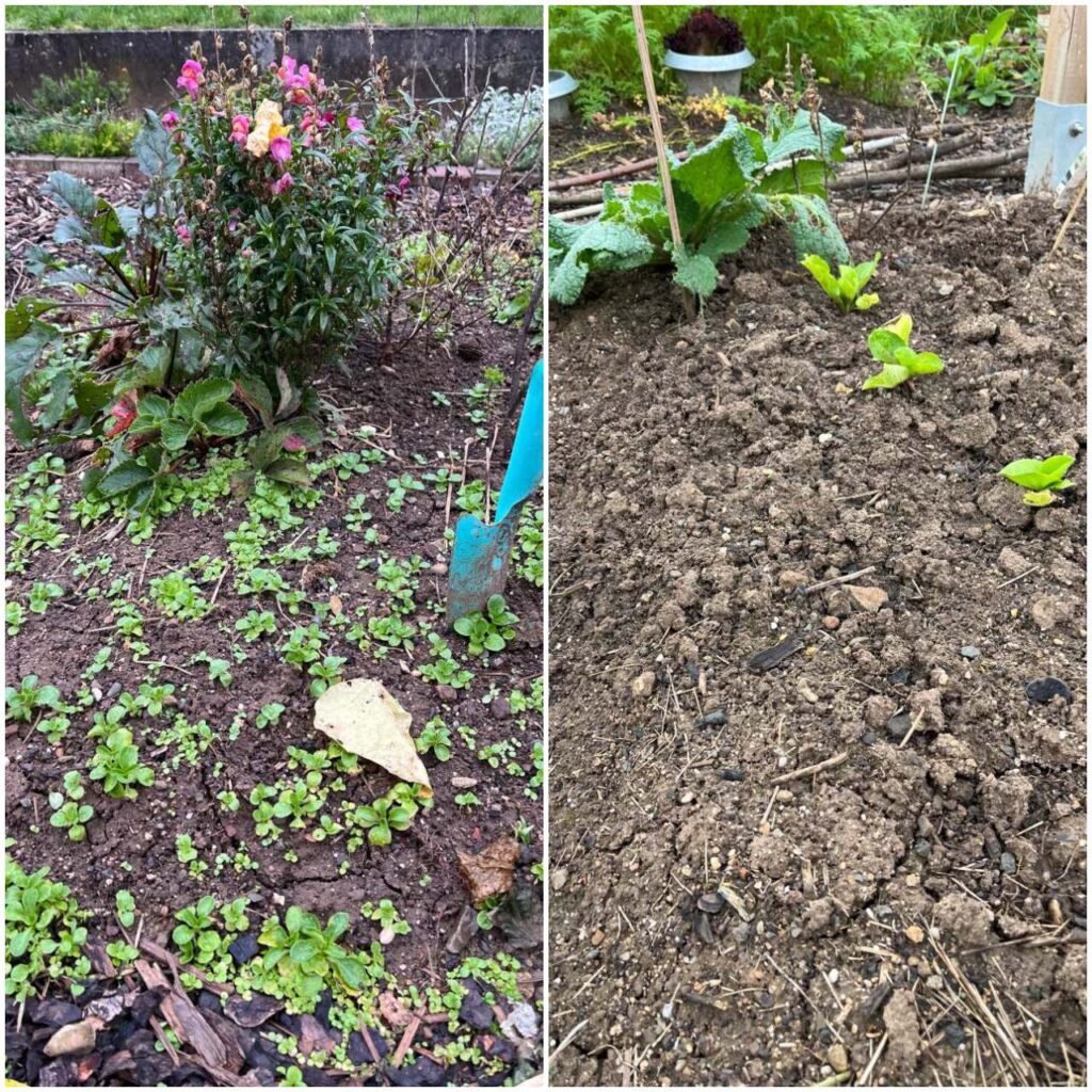 - Salat geerntet, denn zwei meiner zwölf Salatköpfe haben, dank Schneckenringen, tatsächlich überlebt. Zudem entwickelt sich der Ackersalat prächtig, zumindest der, der sich selbst ausgesät hat. Ob noch etwas aus dem Zuckerhut wird, wird sich zeigen.