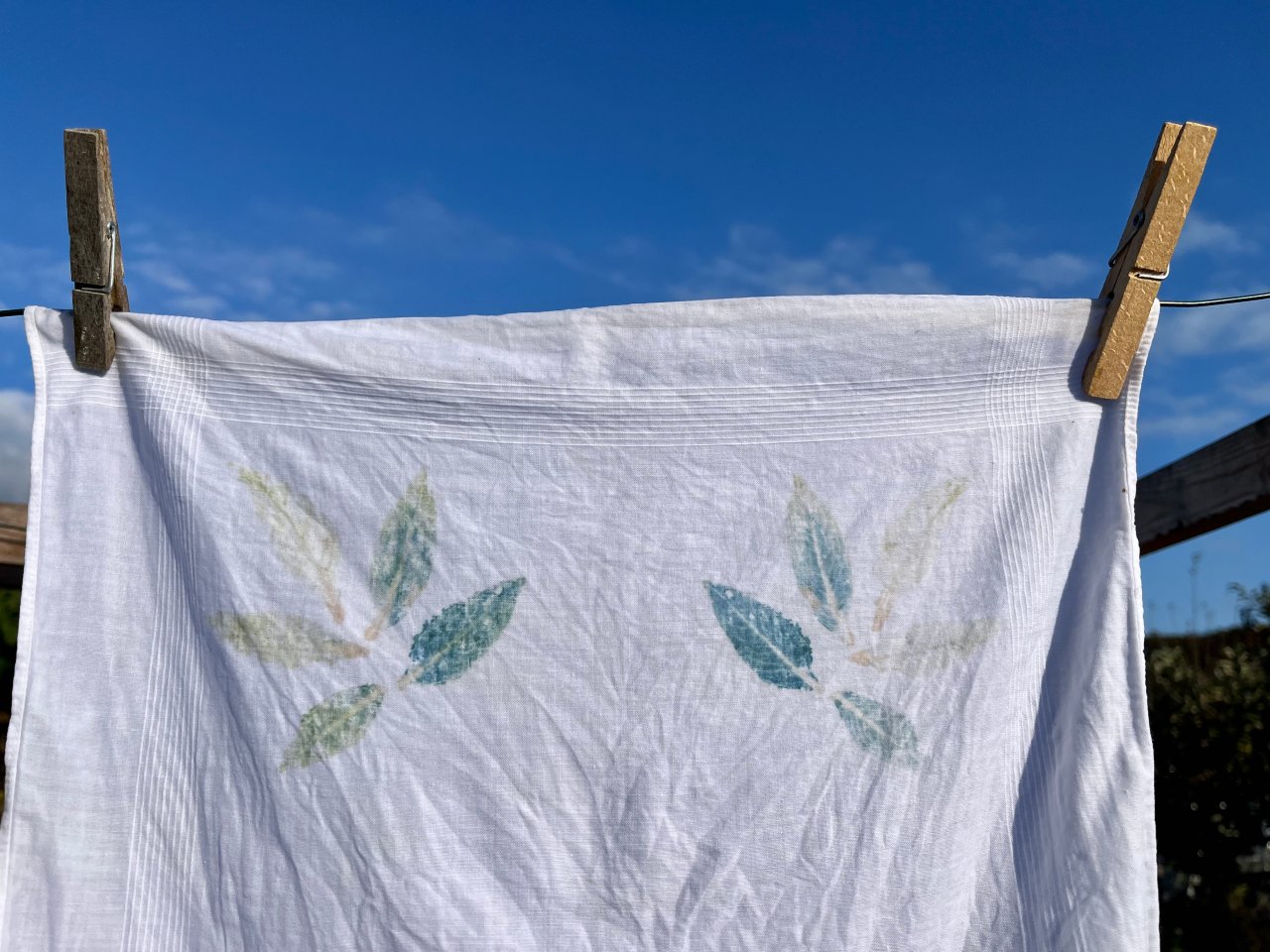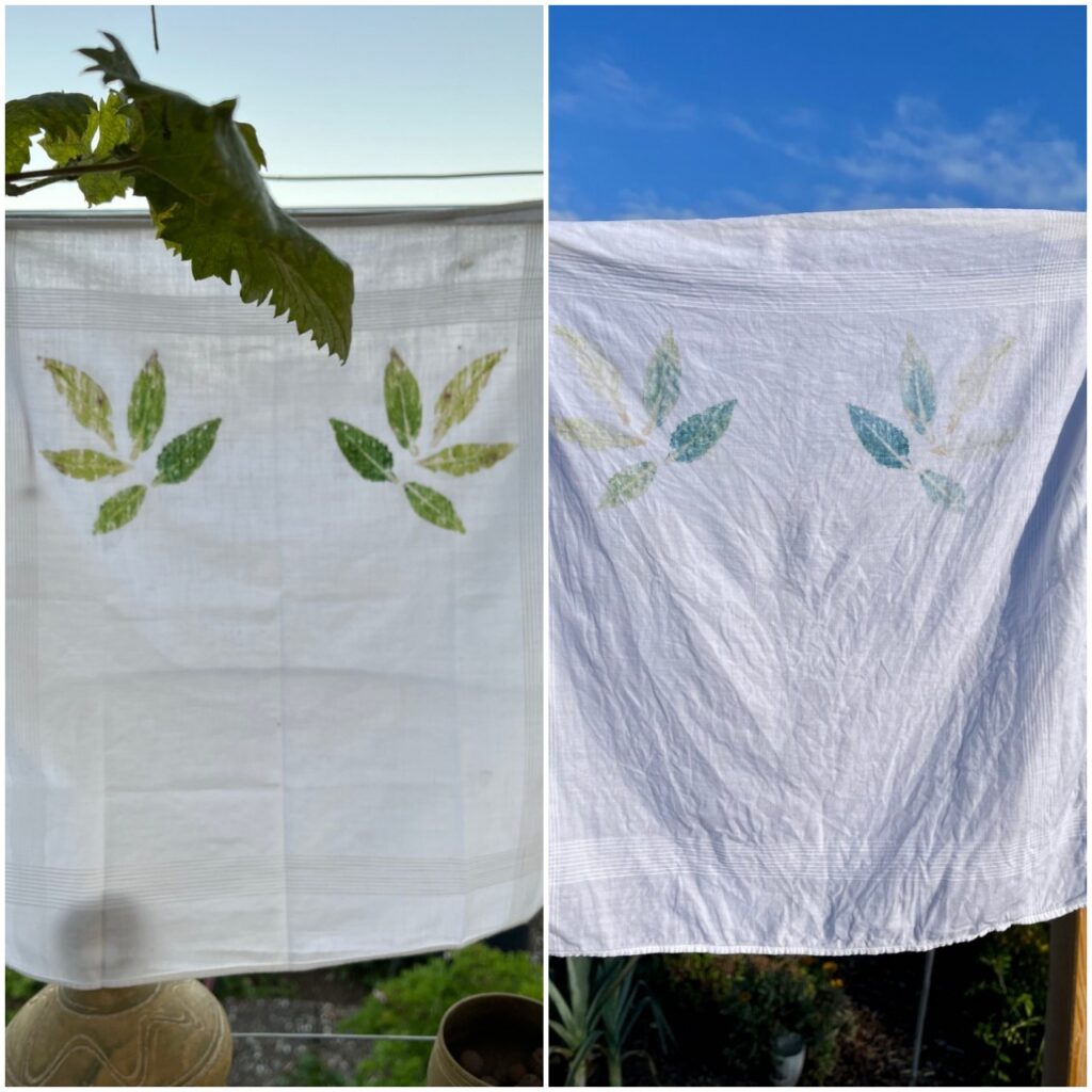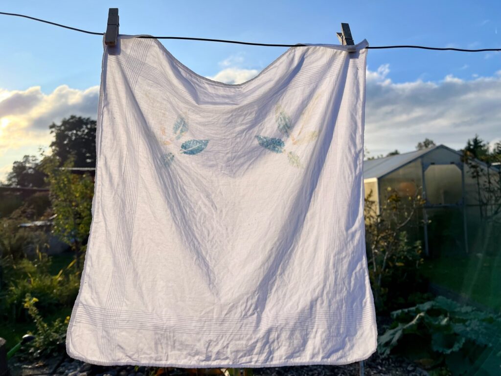 Nach dem Entfernen der Blätter ließ ich das Taschentuch erst einmal trocknen, bevor ich das weitere Vorgehen auf dem Instagram-Beitrag von @white_noise_ch noch einmal durchlas. Der Stoff muss gewaschen werden, um das Blattgrün zu entfernen.
