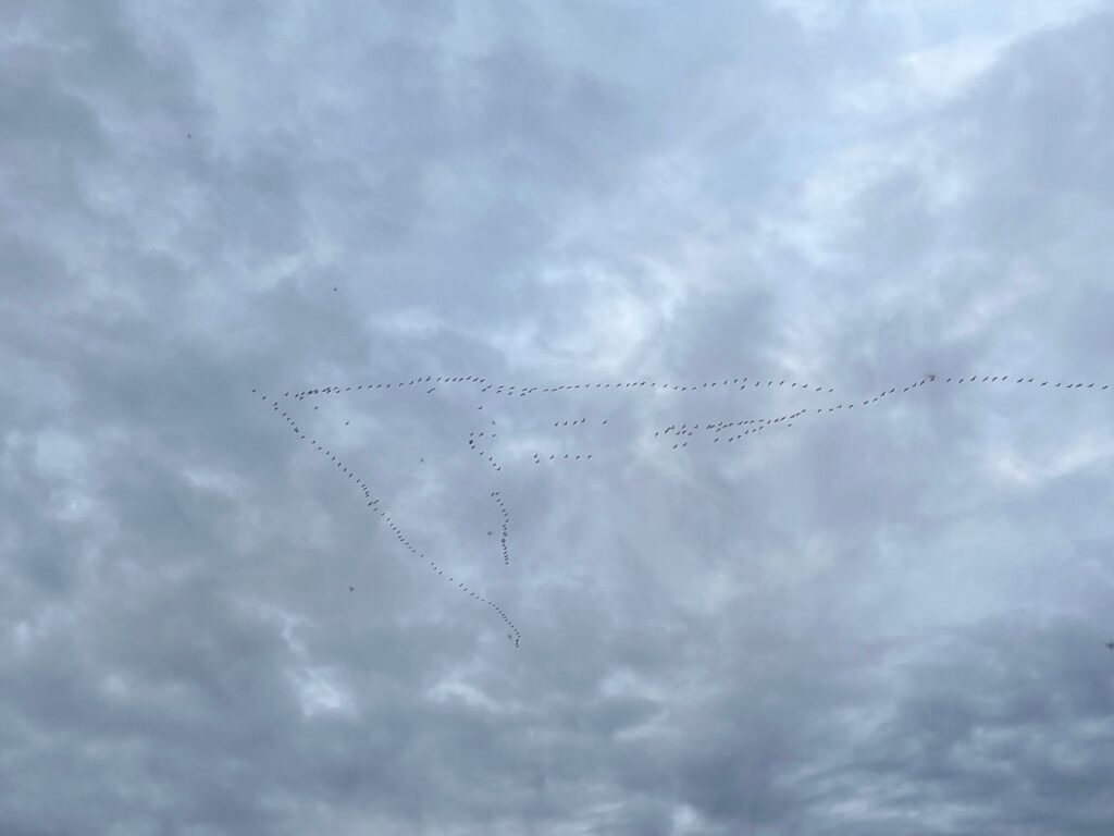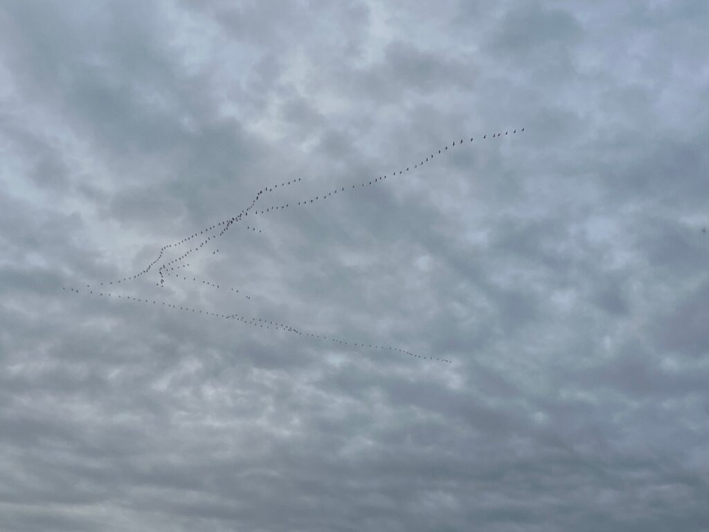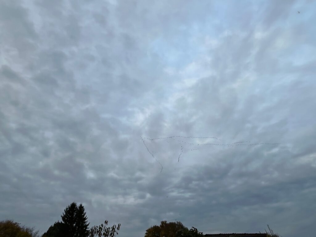 … und am Samstagabend schaute ich vielen Kranichen beim Vogelflug zu. Erst dachte ich es sind Graugänse, wenn da nicht Zeitungsberichte gewesen wären und ich beim Vergrößern der Fotos eindeutig lange Beine entdeckt hätte. Insgesamt sechs Gruppen konnte ich verfolgen. Ein beeindruckendes Schauspiel! Schade, dass ich das geeignete Kameraschätzchen nicht mit dabei hatte.