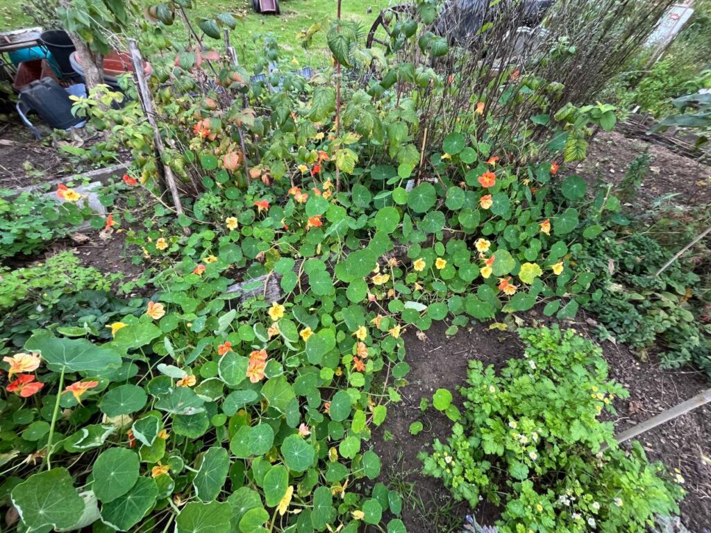 Bei mir stehen immer noch zwei wilde Tomaten. Am Kompost wuchert die Kapuzinerkresse in voller Blüte, die sich selbst ausgesät hatte. Der Knoblauch ist gesteckt. Der Anfang Oktober gepflanzte Zuckerhut hat den Schneckendruck überstanden, dass alle Pflanzen bisher überlebt haben. Vom Feldsalat, der sich wie die Kapuzinerkresse selbst ausgesät hatte, kann ich regelmäßig ernten. Selbstaussaat bringt mitunter die kräftigeren Pflanzen, wie ich inzwischen weiß. Auch beim Anbau von Rosenkohl sammelte ich neue Erfahrungen. Von einem Standort wanderten die ersten Röschen erst in den Topf, dann auf den Teller.