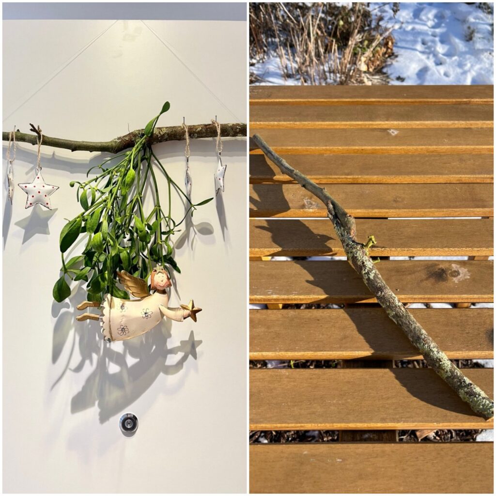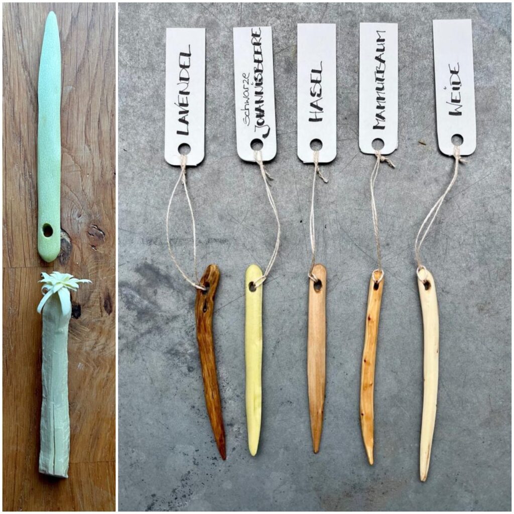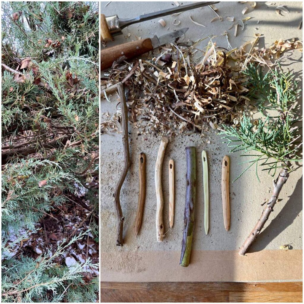 Bei diesen Nadeln verarbeitete ich dünne Äste von Sträuchern, wobei ich vor allem bei der Heckenrose, das Problem mit einem weichen Kern aus Mark hatte. Das sollte mir bei der zweiten Schnitzrunde wieder begegnen. Bei der dritten war ich dann schon klüger und wählte dickere Äste, wie den von meiner abgehängten, abdekorierten, weihnachtlichen Türdekoration.