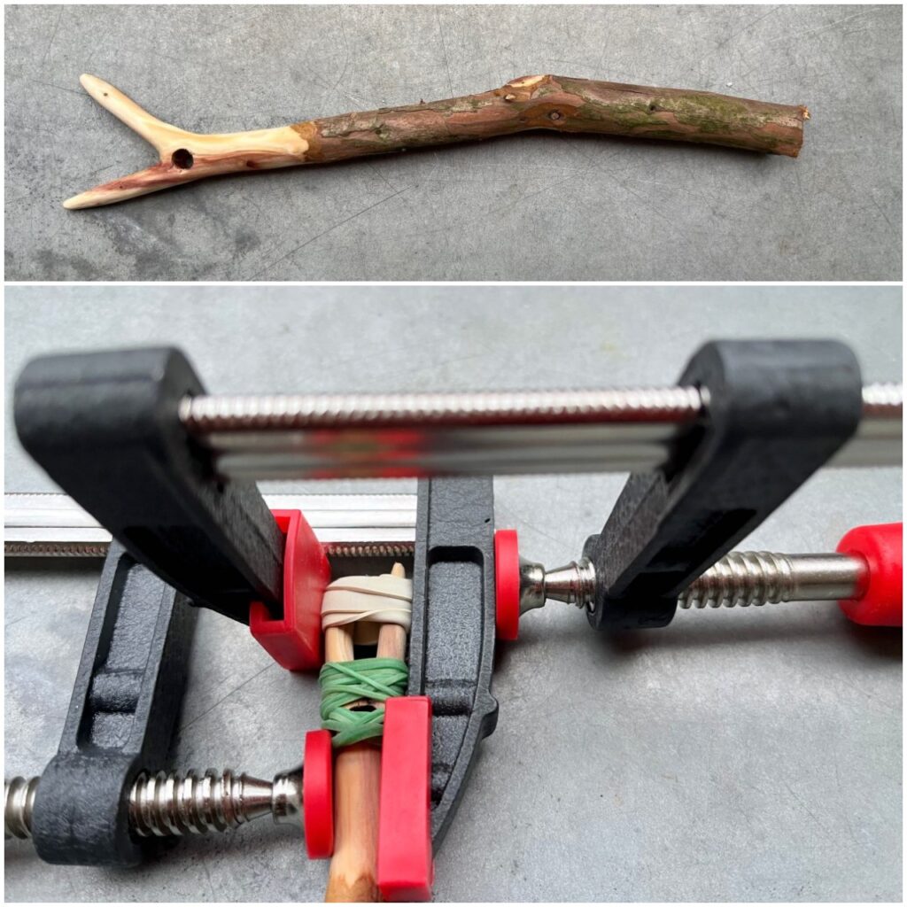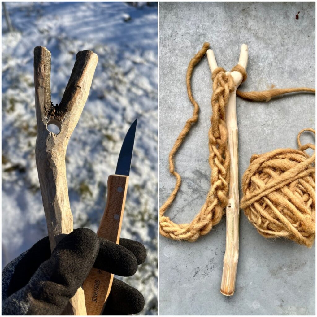 So hübsch die zweite Flechtgabel aus einem Nadelholz aussieht, noch ist sie nicht funktional. Daran wird gearbeitet und notiert: Das nächste Mal erst die Form verändern, dann bohren.