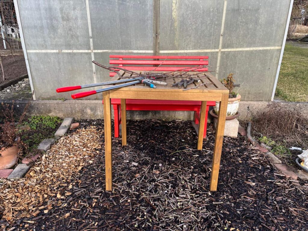 Wenn die Temperaturen es erlaubten schnitt ich Äste klein. Der Astschnitt landet direkt auf den Wegen. Das hat sich in den vergangenen Jahren bewährt und spart gekauften Hackschnitz.
