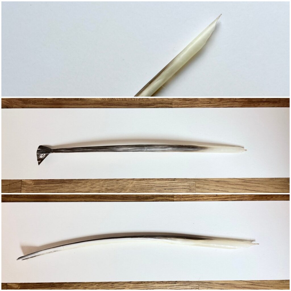 Wo der schöne Rest der (Truthahn-)Feder geblieben ist? Weg! Die Fahne der Vogelfeder wurde in der Regel abgeschnitten, da sie einfach beim Schreiben und Zeichnen im Weg war. So ging man auch mit den restlichen Federn entlang des Schaftes vor. Sie wurden abgezupft oder abgeschabt, dass am Ende eine Feder entsprechend eines einfachen Federhalters entstand, wie wir ihn kennen.