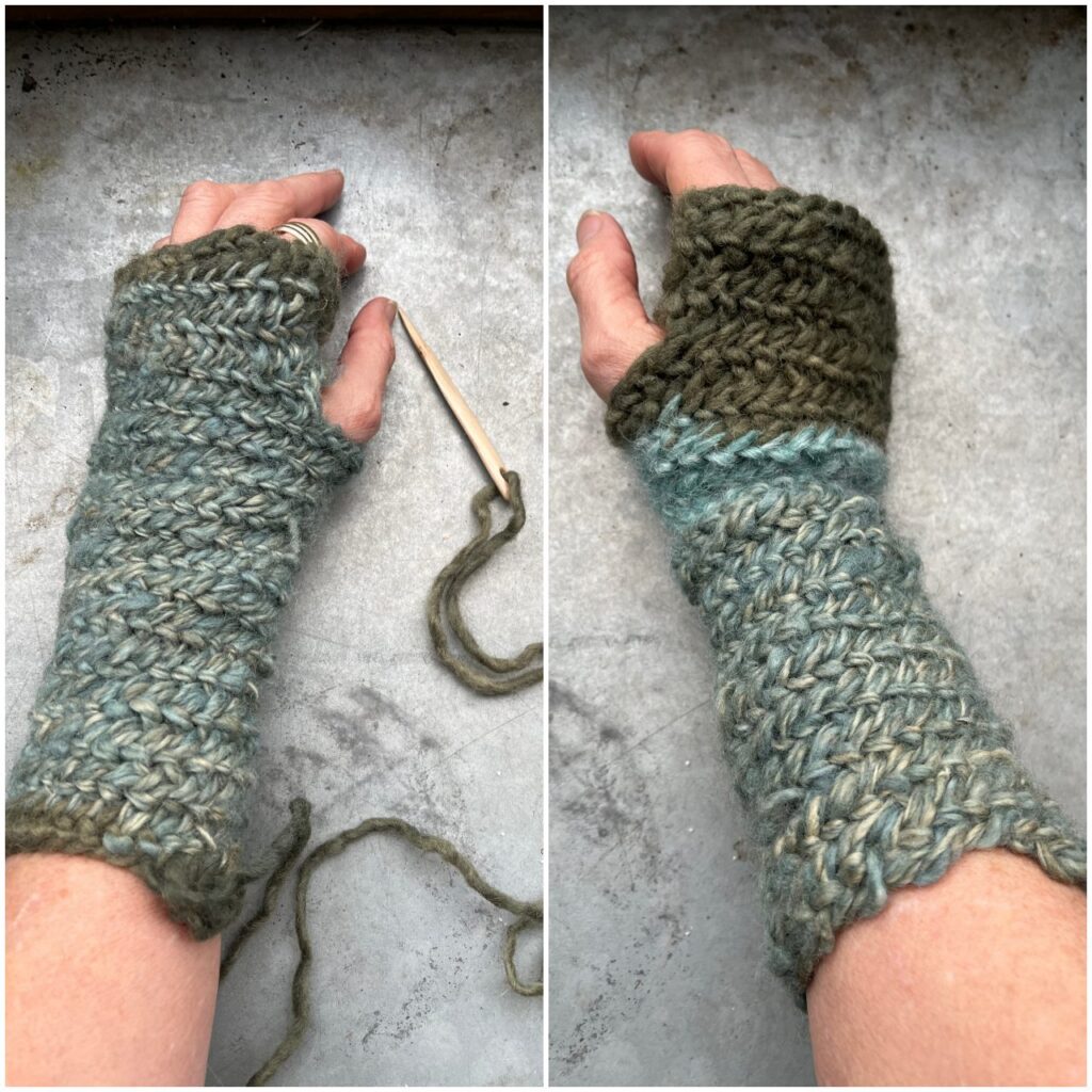 - fast fertig und tatsächlich so gut wie abgeschlossen sind nun die Armstulpen, die ich durch Nadelbinden hergestellt habe – diese Technik wird auch Inhalt einer Fortbildung sein, die für November geplant ist 😊