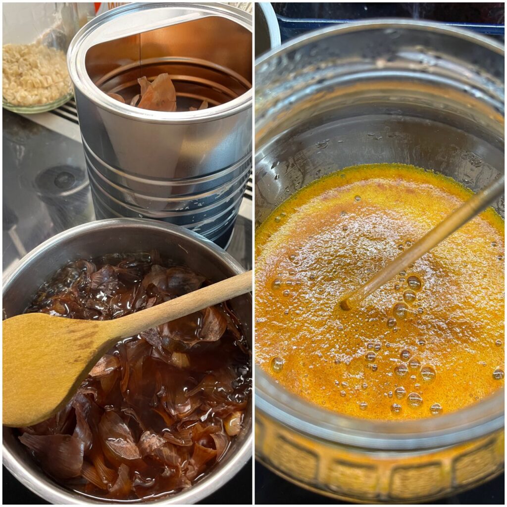 - an anderer Stelle köchelte erst ein Farbansatz aus Zwiebelschalen, zum Gewinnen von Pigmenten. Teil 1 der Herstellung ging fix und seitdem dröppelt das Zeug so vor sich hin, immer wieder frisch gespült, durch neue Filter, … es dauert auch hier seine Zeit
