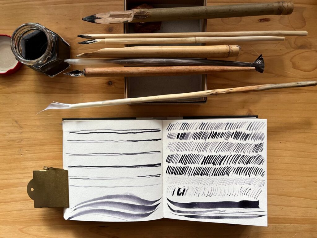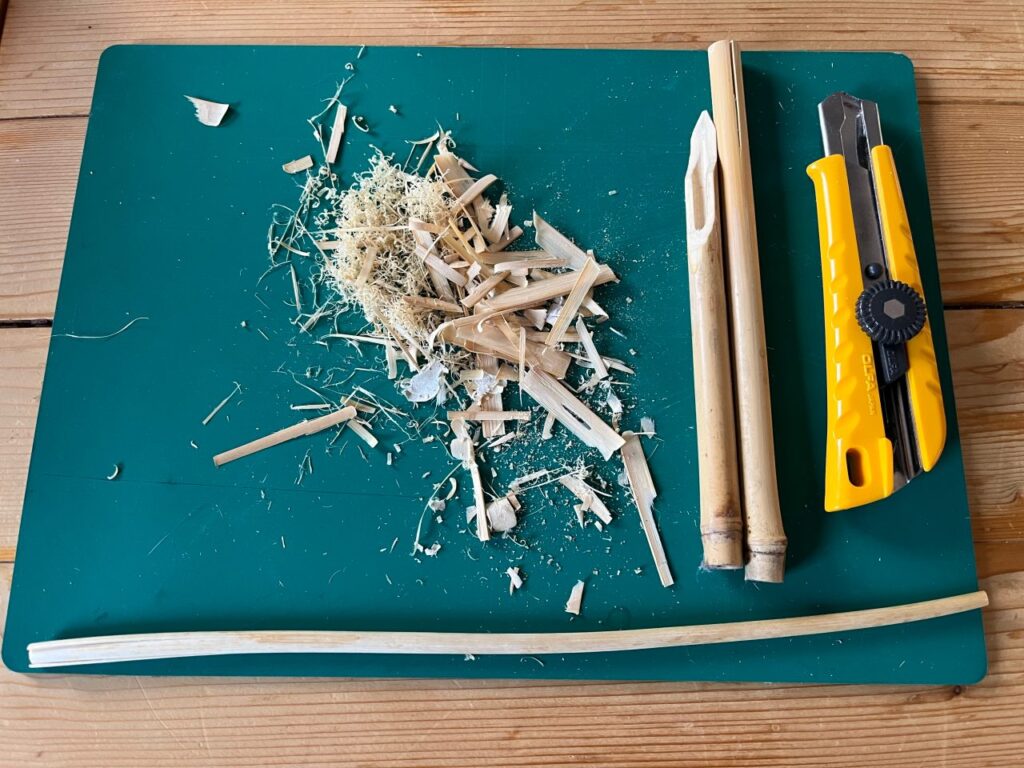 Zuerst entstand eine weitere Zeichenfeder aus Bambus und ein Halter für Kreiden. Schilf und die Halme von Pampasgras lassen sich ebenfalls verwenden, sind allerdings mit Vorsicht zu benutzen, da nicht besonders stabil. In meinem Fundus sind immer noch eine Reihe Bambusfedern, von ehemaligen SchülerInnen geschnitzt, die ich in Ehren halte. Wenn sie wüssten, dass ich jetzt einen Weg gefunden habe, wie sich das Bambus leichter bearbeiten lässt: