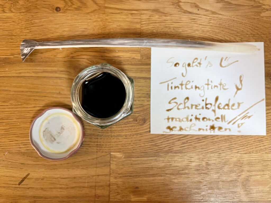 Schreibfedern aus Vogelfedern zu schneiden hat etwas von viel Versuch und Irrtum, Frust und Freude. Dank eines Videos von Caroline Ross, foundandground.com, startete ich einen neuen Versuch. Wie üblich bei solchen Spontangedanken lief das nachts ab, deshalb auch das folgende etwas unscharfe Bild. Doch es war solch ein WOOHOO-Moment, dass das Bild hier erscheint, die Tinte noch feucht.