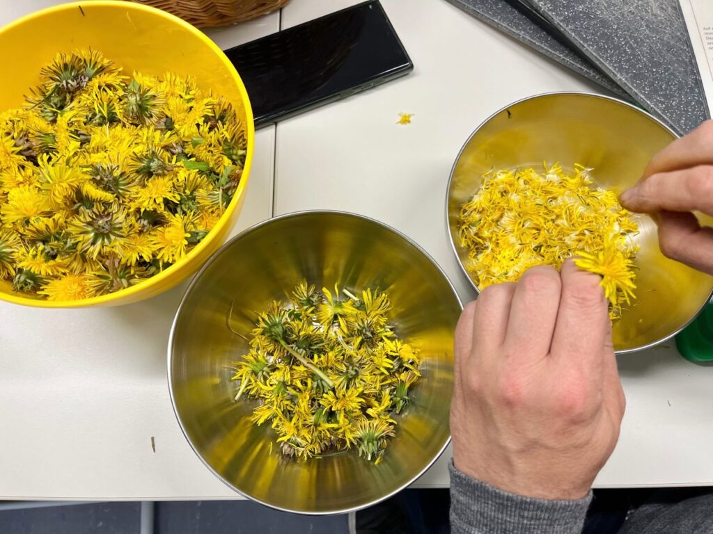 Löwenzahn wird jedoch zu Unrecht so verteufelt, denn die ganze Pflanze ist zu verarbeiten und dabei nicht nur genießbar. Von der Wurzel, über das Blatt, bis zur Blüte, hat der Löwenzahn wertvolle Inhaltsstoffe. Deshalb ist Löwenzahn ein wichtiger Teil der April-Fortbildung am LSZU, dem Landesschulzentrum für Umweltbildung, an der ich beteiligt bin. Das Problem in diesem Jahr? Das Wetter! Wenn es regnet, die Sonne fehlt, bleiben die Blüten in den Blütenkörbchen geschlossen. Doch ohne Blütenernte würde das komplette Modul der Fortbildung ausfallen. Was war ich glücklich es am späten Nachmittag endlich an einer Stelle gelb leuchten zu sehen! Nichts wie raus zum Sammeln von Löwenzahnblüten.