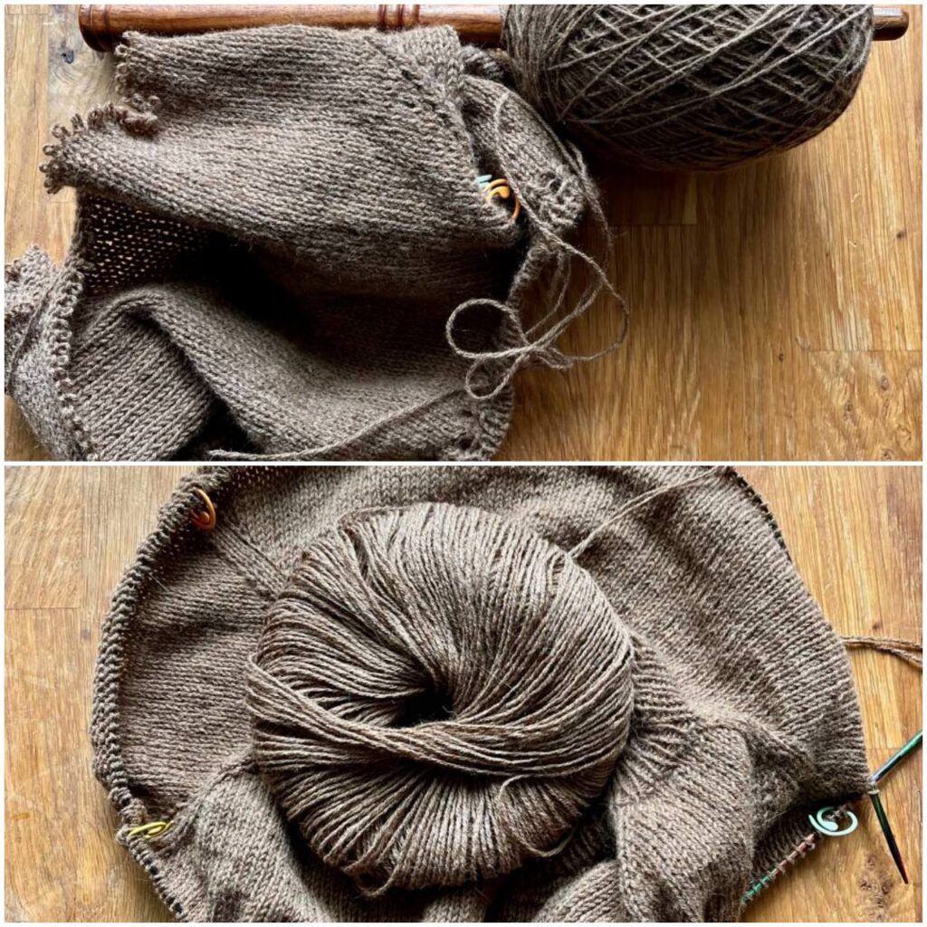 Trotzdem arbeitete ich weiter, nadelte bei dem von oben nach unten Gestricktem schon einmal das Halsbündchen. Fand das Ganze zwischendurch dann doch ganz nett, dass ich weiterarbeitete.