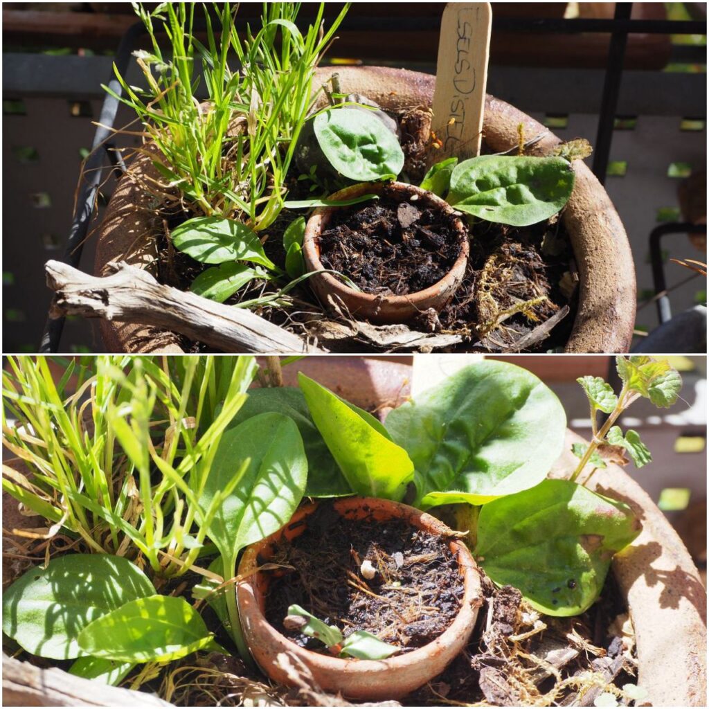 In einem anderen Topf hatte ich Mariendistel ausgesät, die jetzt ebenfalls keimt! Auch diese Pflänzchen werde ich bald in den Garten umsiedeln.